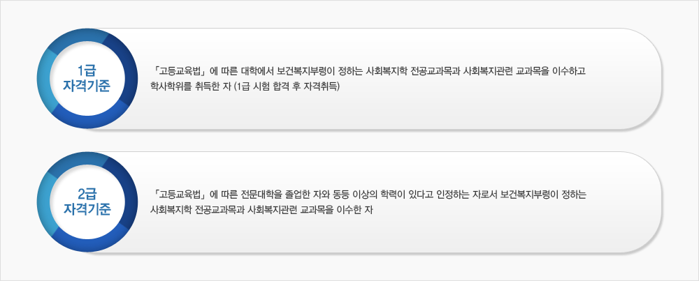 「고등교육법」에 따른 대학에서 보건복지부령이 정하는 사회복지학 전공교과목과 사회복지관련 교과목을 이수하고 학사학위를 취득한 자 (1급 시험 합격 후 자격취득)